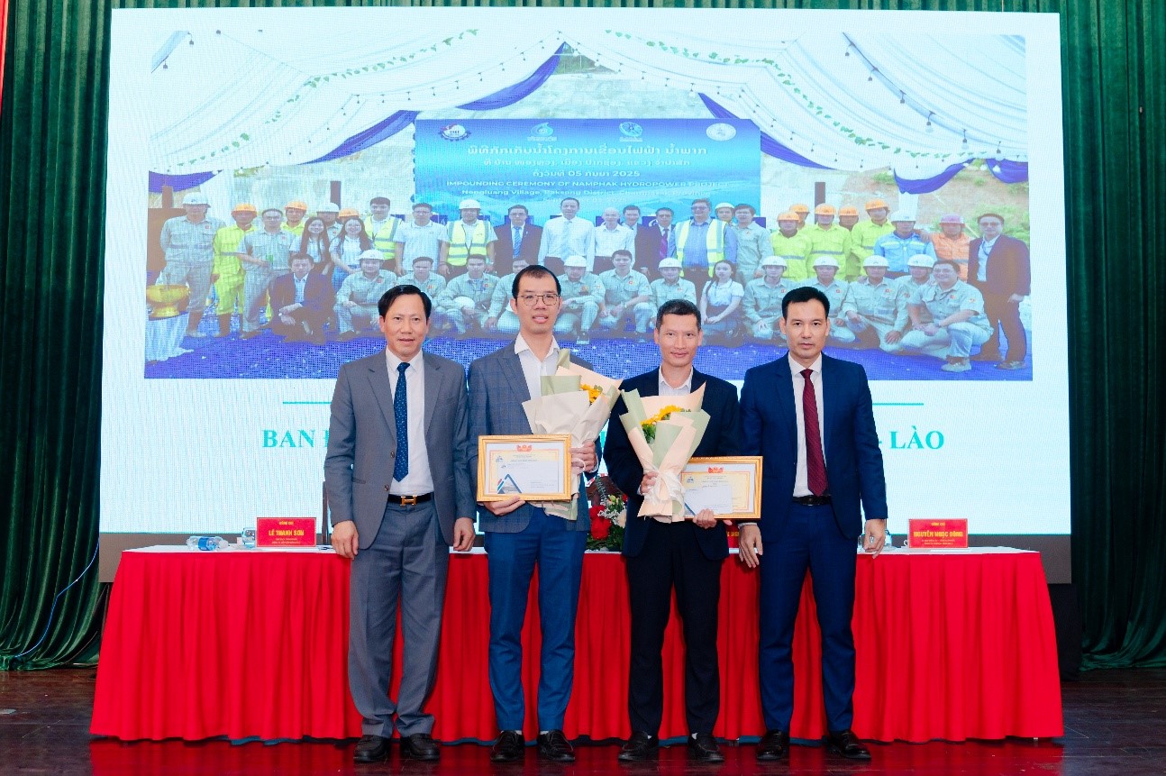 Đồng chí Trần Anh Đức và Đồng chí Lê Văn Tuấn trao Giấy khen của Đảng ủy TCT Sông Đà cho 02 đ/c Nguyễn Ngọc Đông Bí thư Đảng ủy và Nguyễn Mạnh Toàn phó Bí thư Đảng ủy đã hoàn thành xuất sắc nghiệm vụ năm 2025
